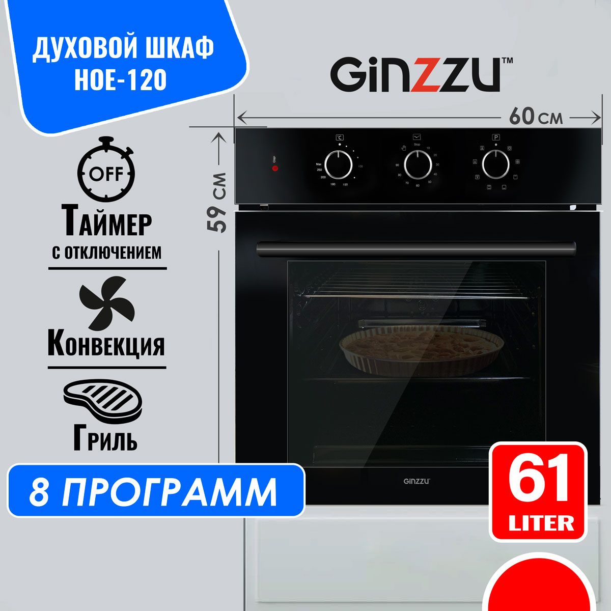 Встраиваемый электрический духовой шкаф HOE-120 объемом 61л, 8 программ, таймер с отключением, в комплекте глубокий противень и решетка. Энергоэффективность A+ позволяет духовке быстрее выходить на режим и экономить электроэнергию. Нижний ТЭН закрытый.