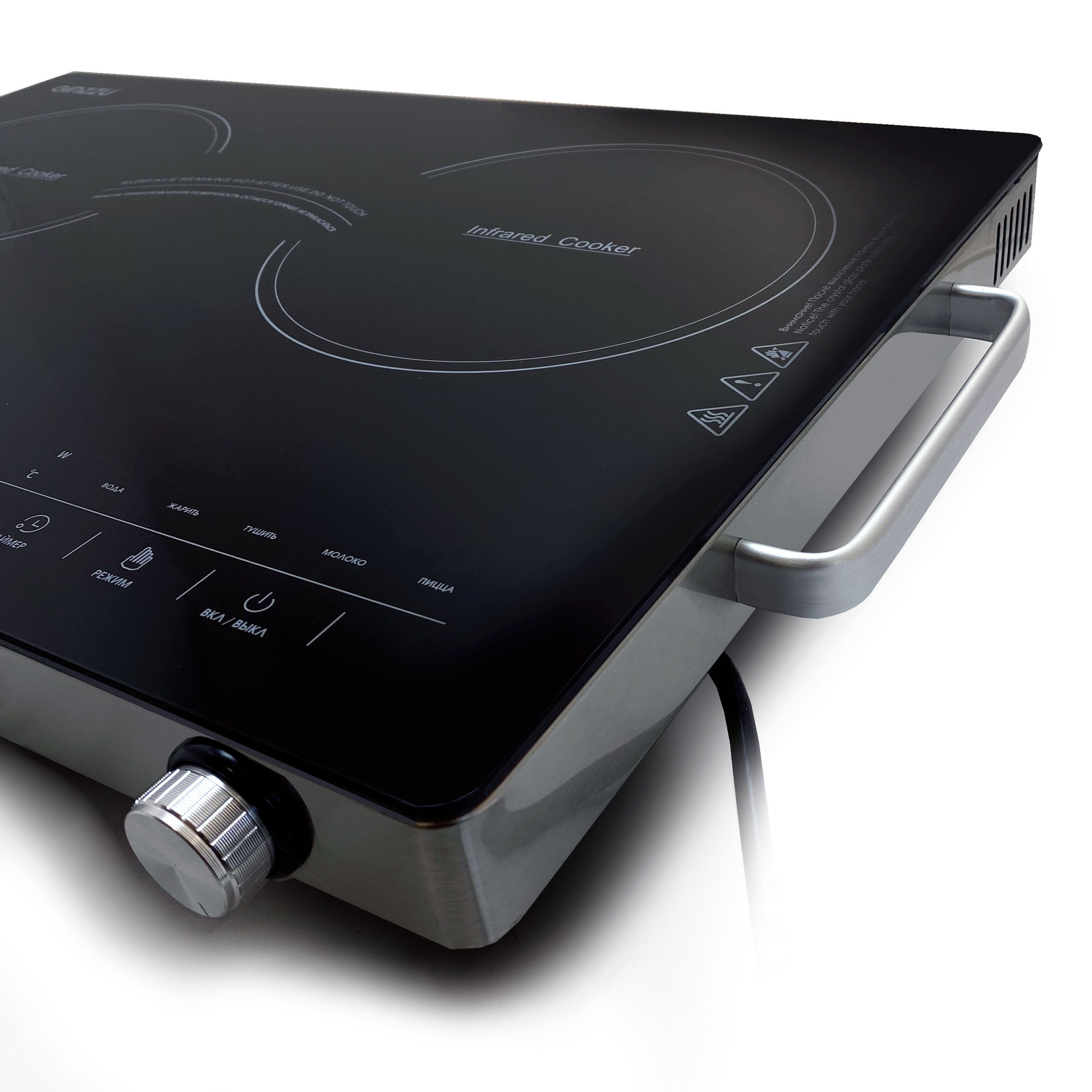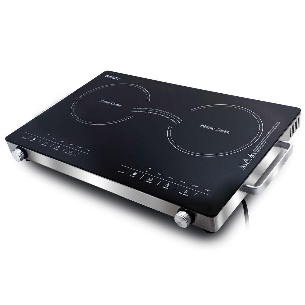Мощность 2000+2000 Вт (макс 3000Вт). Таймер. Электронное управление. Защита от перегрева. Удобные ручки для переноски. Работает с любой посудой.