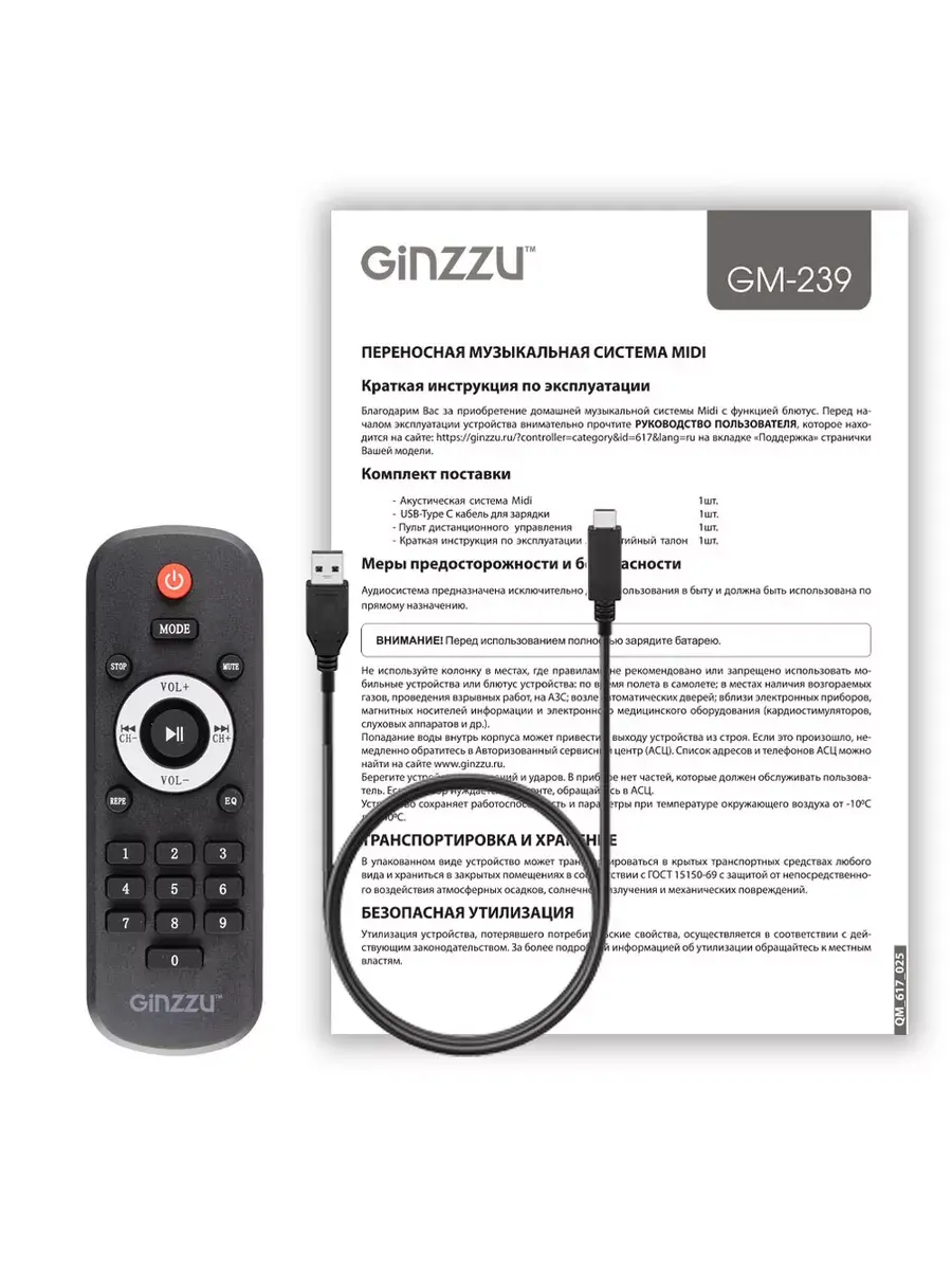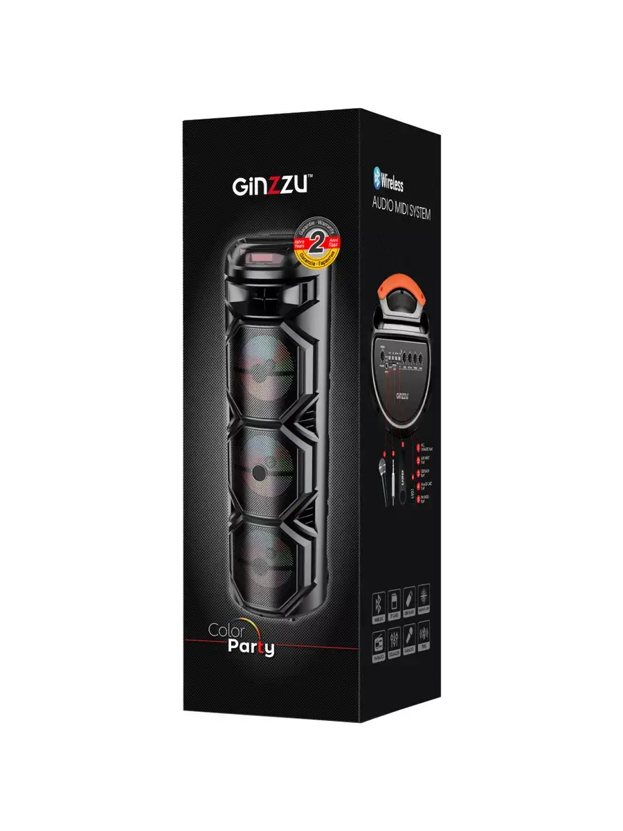 Акустическая Караоке система MIDI Ginzzu GM-239 с Bluetooth, 60Вт, КАРАОКЕ функция - микрофон DC-jack 6,5 мм(микрофон в комплект не входит), 3 динамика по 8 дюймов.