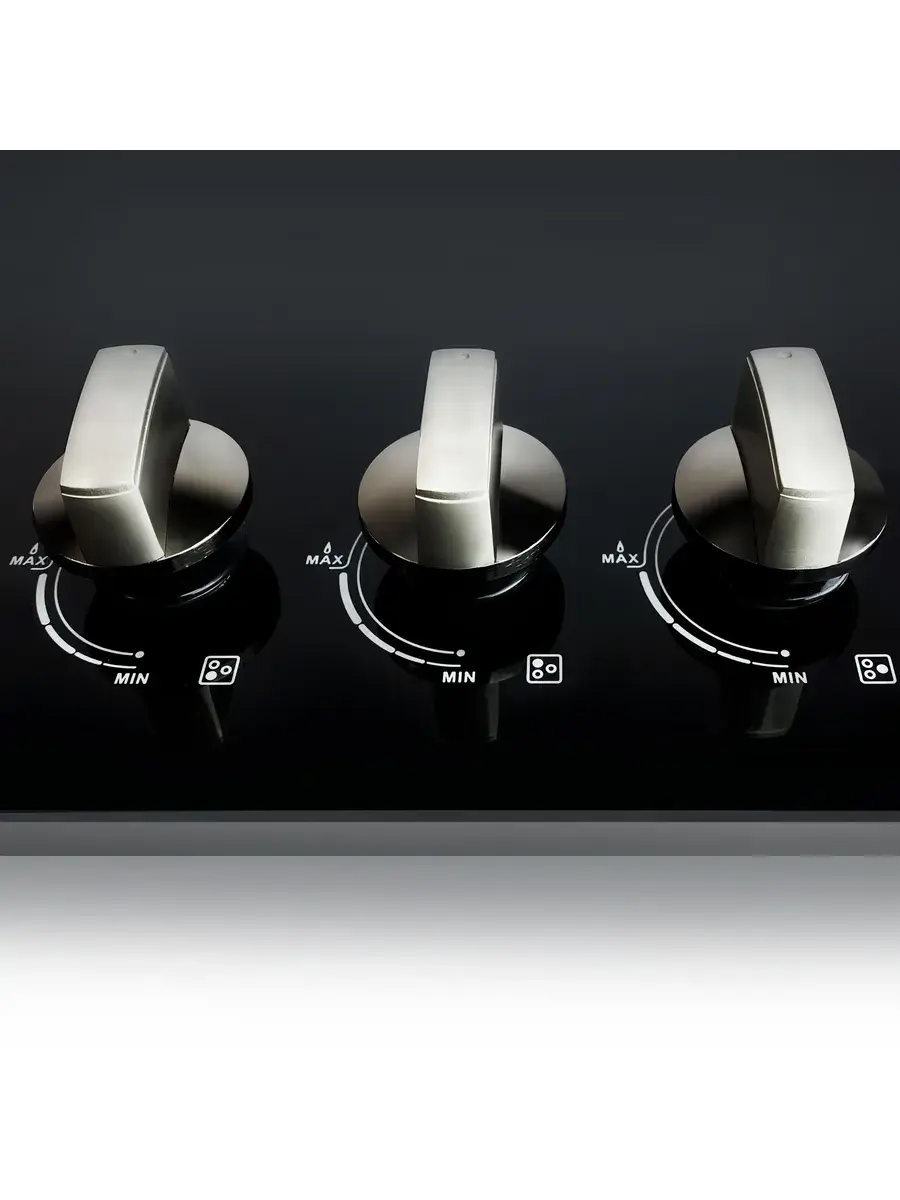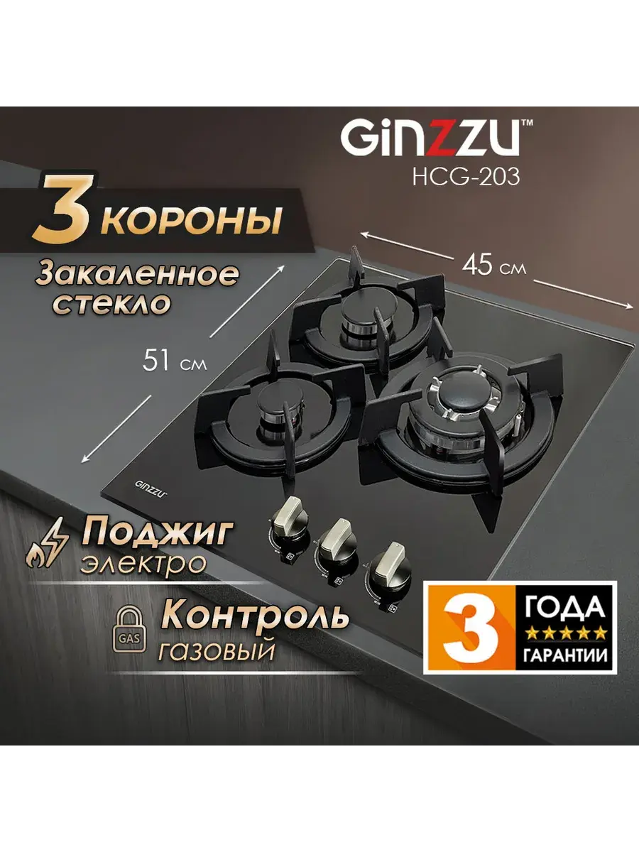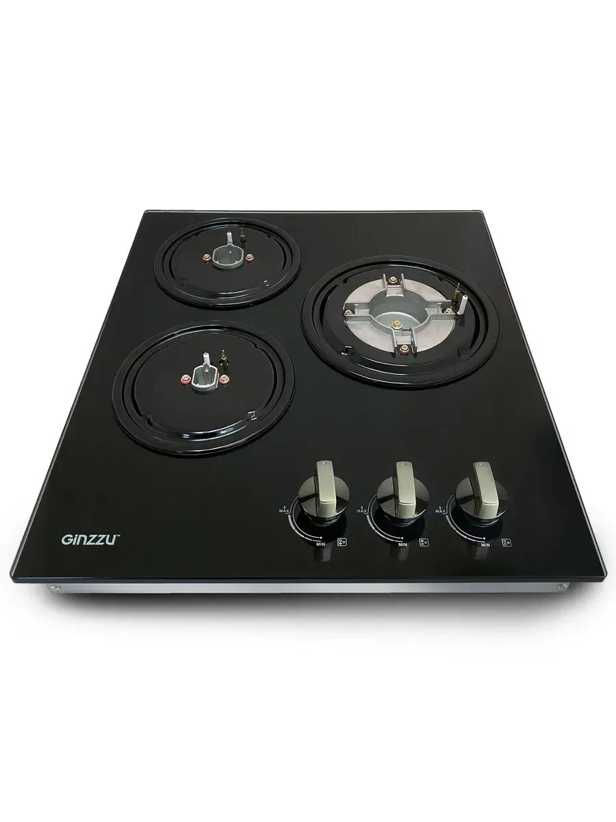 Газовая варочная поверхность HCG-203 Ginzzu bзготовлена из черного закаленного стекла: привлекательный вид, легкость очистки от загрязнений и стойкость к неблагоприятным воздействиям. Данная модель оснащена 3-мя конфорками. Имеет датчик газового контроля и электроподжиг. С помощью поворотных переключателей можно плавно регулировать интенсивность нагрева. Материал решеток (держателей) - чугун. Посадочное отверстие 425*475*R25мм